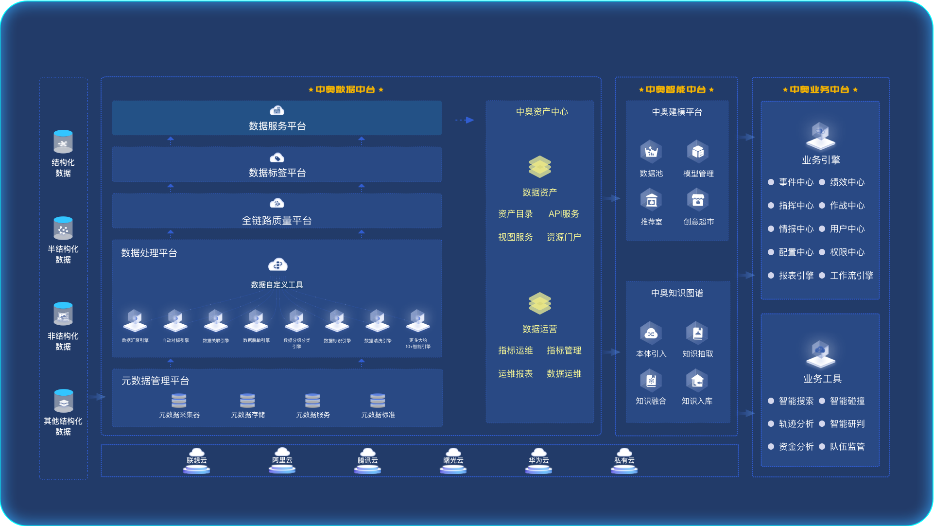 中奧經(jīng)過多年政務(wù)行業(yè)經(jīng)驗(yàn)積累,依托于云計(jì)算、大數(shù)據(jù)和人工智能技術(shù),沉淀了一套以“數(shù)據(jù)+智能+業(yè)務(wù)”三中臺為核心的完整技術(shù)架構(gòu)體系,數(shù)據(jù)中臺解決了數(shù)據(jù)孤島、數(shù)據(jù)多源、重復(fù)開發(fā)等問題,把數(shù)據(jù)資源轉(zhuǎn)化為數(shù)據(jù)資產(chǎn),為用戶支撐高效的數(shù)據(jù)服務(wù);智能中臺集數(shù)據(jù)管理、算法管理、模型開發(fā)、方案構(gòu)建于一體,為用戶挖掘數(shù)據(jù)價(jià)值、建設(shè)智能應(yīng)用提供解決方案;業(yè)務(wù)中臺快速響應(yīng)不同用戶多樣性應(yīng)用需求,實(shí)現(xiàn)彈性“能力復(fù)用”。