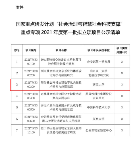 由浙江大學(xué)牽頭的“基層社會網(wǎng)絡(luò)治理數(shù)字化關(guān)鍵技術(shù)研究與應(yīng)用示范”項目獲批成為2021年第一批國家重點研發(fā)計劃“社會治理與智慧社會科技支撐”重點專項。項目圍繞“社會治理新模式、社會治理要素、時空大數(shù)據(jù)關(guān)聯(lián)方法、社會多元感知技術(shù)、事件管理、人員畫像軌跡、社會基層網(wǎng)格治理示范“等目標(biāo)進(jìn)行研究。